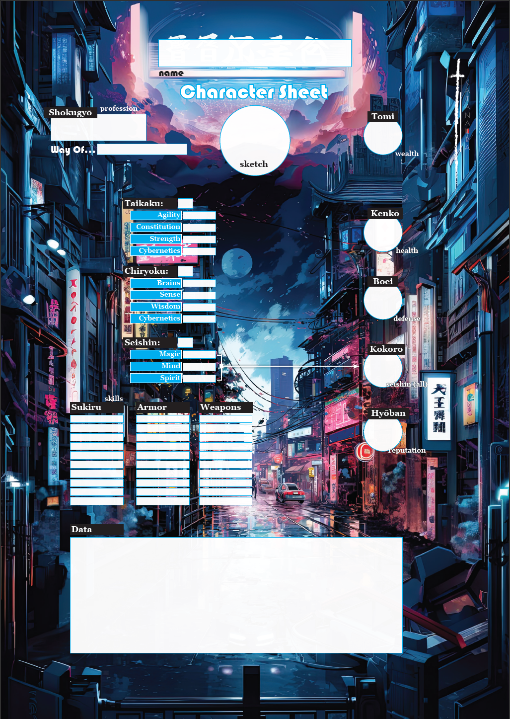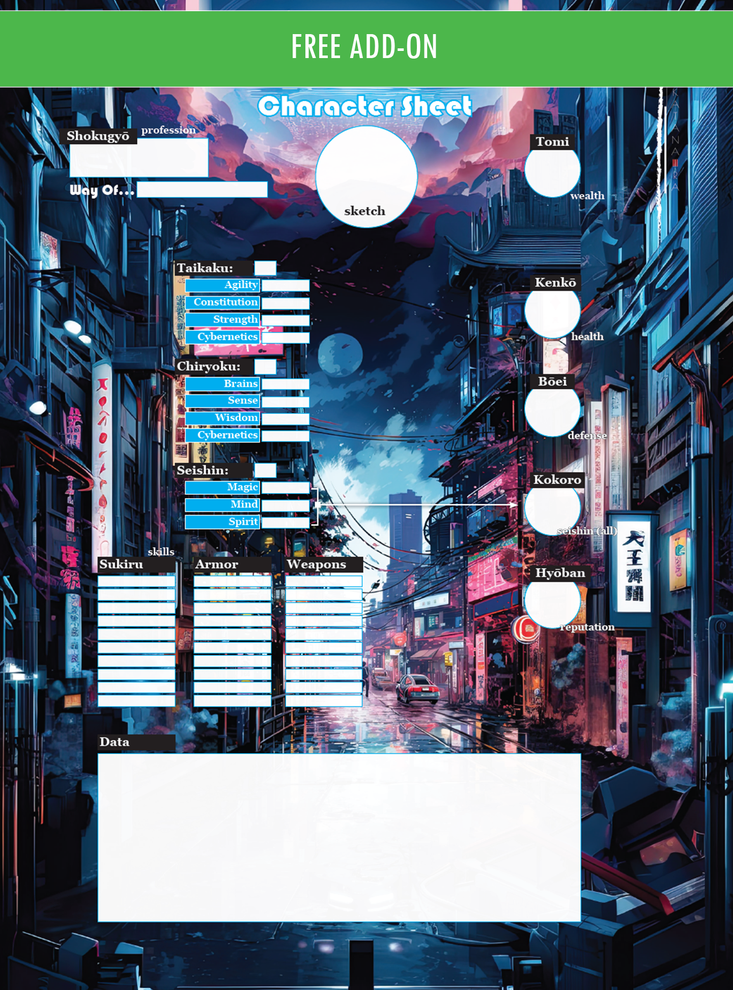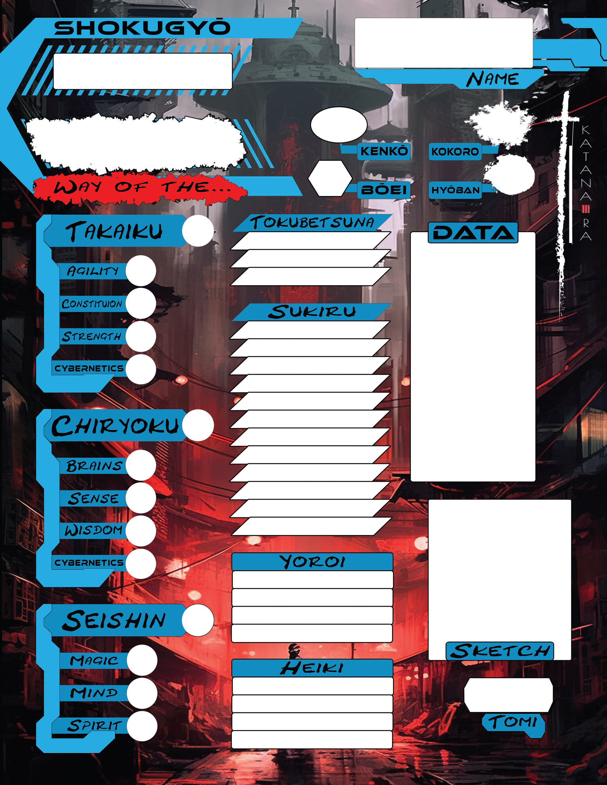 Ein Satz Charakterbögen für Katana-Ra, sowohl im druckerfreundlichen als auch im vollfarbigen Format.