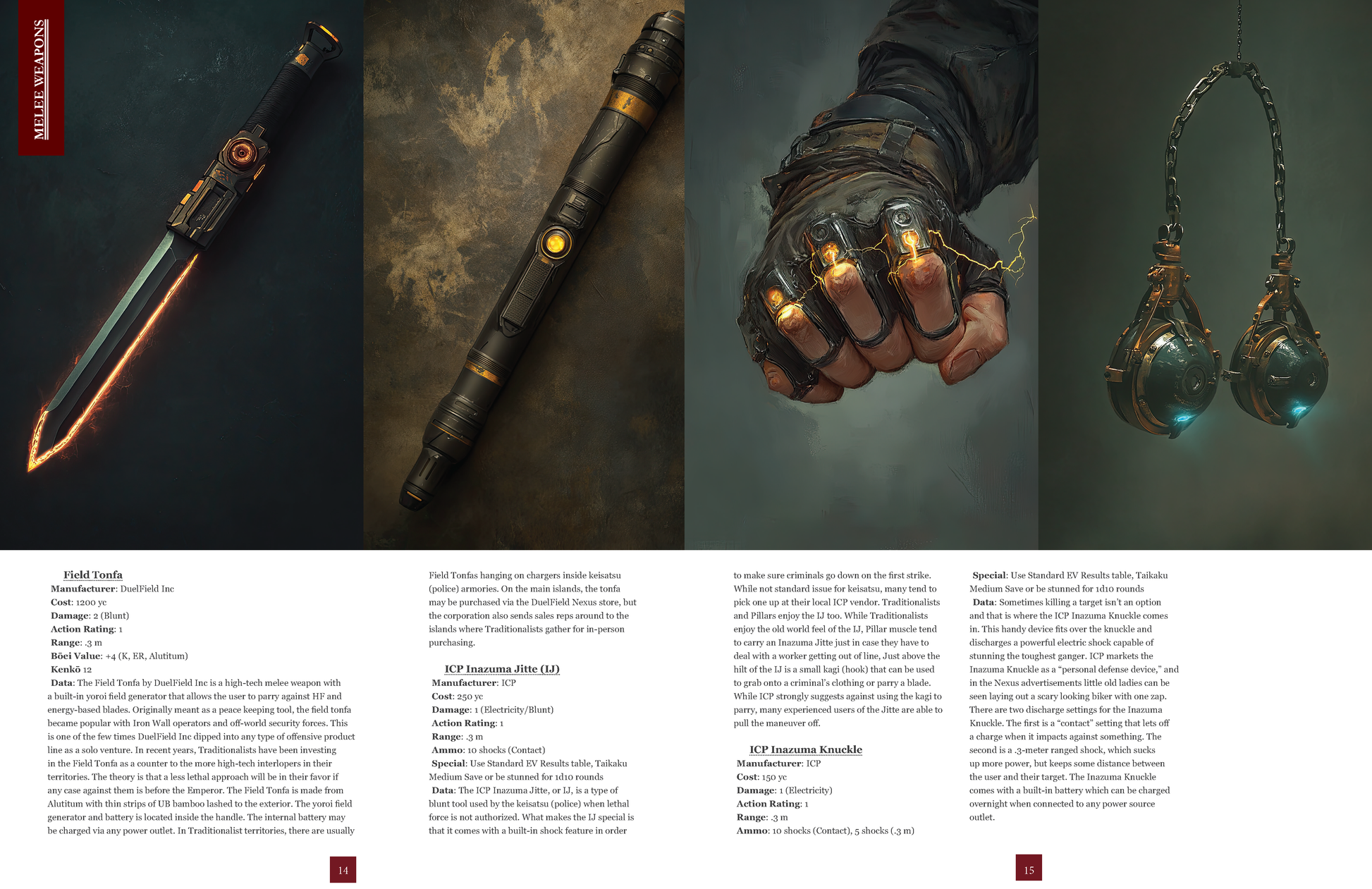 这是一个包含你在Katana-Ra世界快速开启战役所需一切内容的庞大资料库。为玩家和游戏主持人量身打造的快速启动资料库——你将找到主要NPC、物品、武器、配件、仪式、魔法等的预设描述和数据。